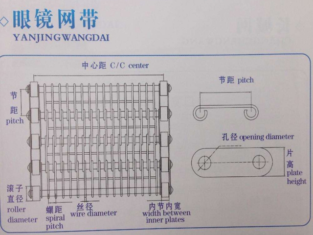 眼鏡網(wǎng)帶一般節(jié)距:38.1mm、50.8mm,穿桿采用8mm-10mm,鏈條節(jié)距38.1mm、50.8mm.材質(zhì)多為304不銹鋼。