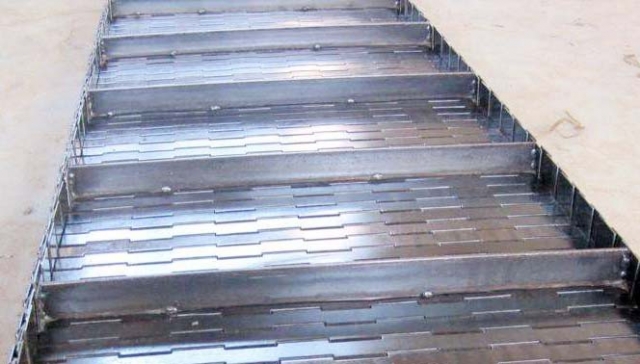 輸送鏈板也可成為排屑鏈板,按節(jié)距可以分為31.5,38.1,50.8,63.5,101.6的,制作材質(zhì)可為碳鋼板和不銹鋼板,鏈板的寬度和長度是按客戶要求來制作的,鏈板的防腐處理可以分為煮黑與鍍鋅兩種
